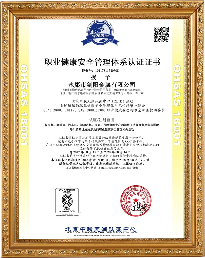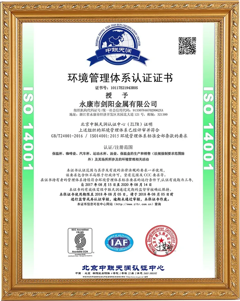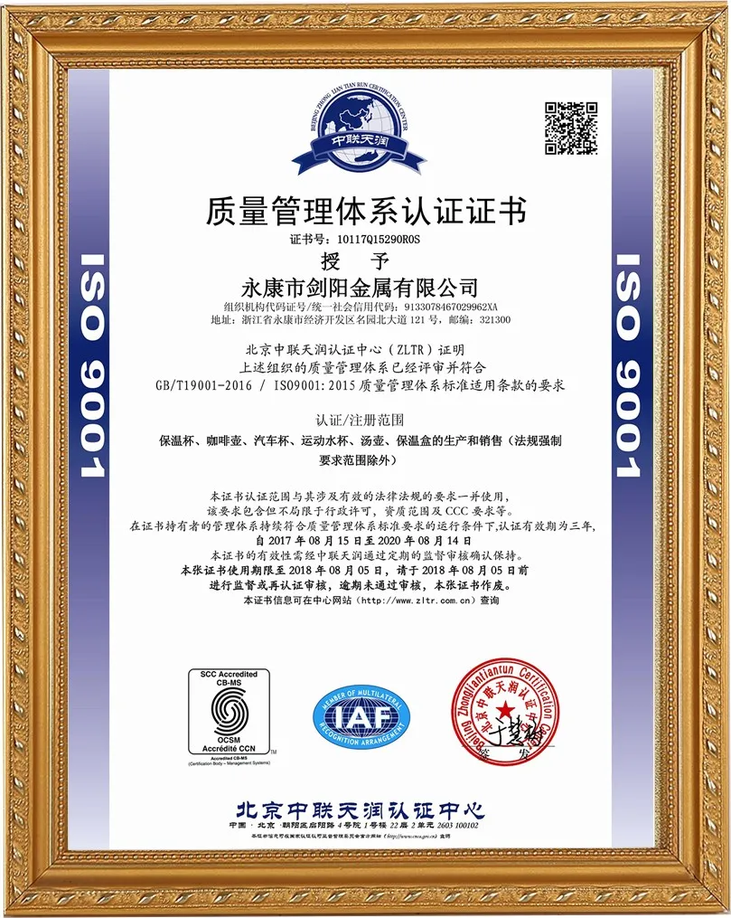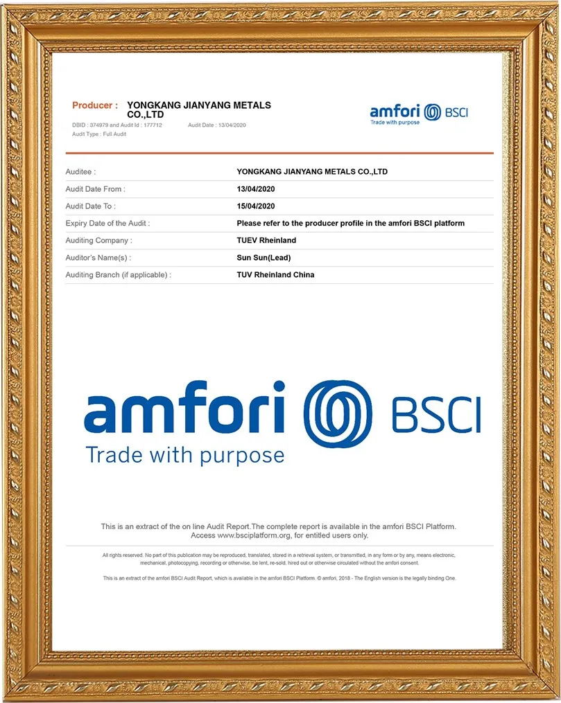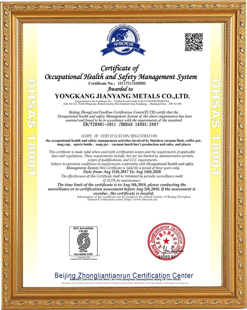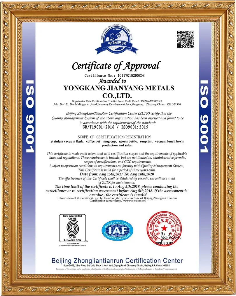 Компания Yongkang Jianyang Metals Co., Ltd. была основана в 2008 году и занимает площадь 20 000 квадратных метров. Ежедневный объём производства составляет 20 000 изделий. Более 18 лет мы занимаемся производством термосов, кофейных кружек и термоконтейнеров для пищевых продуктов. Мы также имеем сертификаты BSCL SEDEX, WCA, ISO9001, ISO14001 и RCS.
